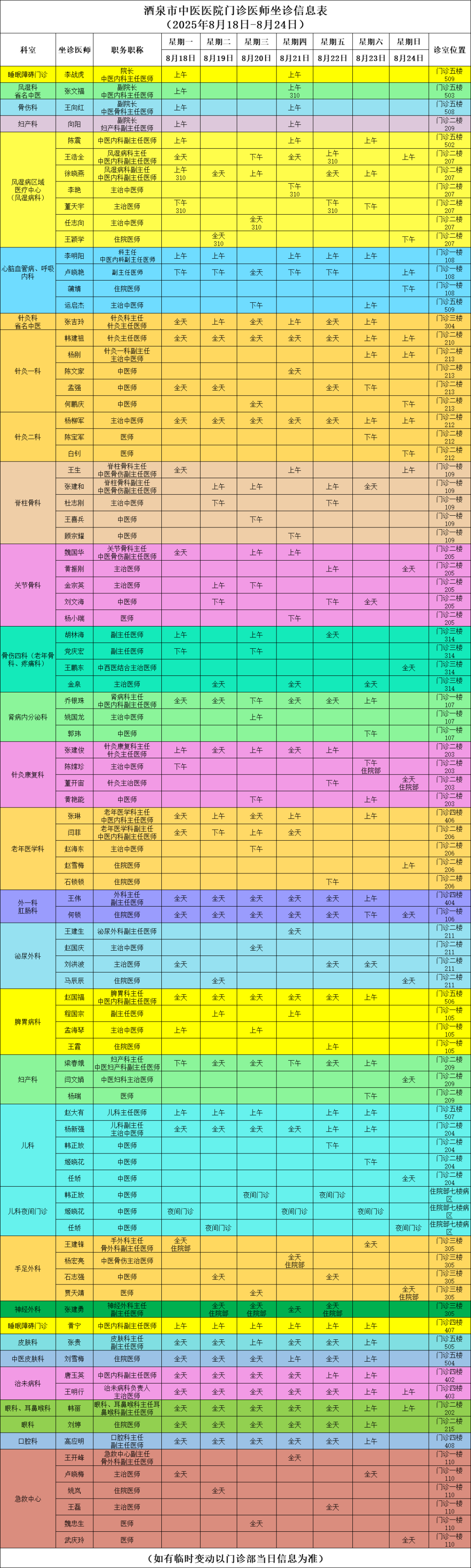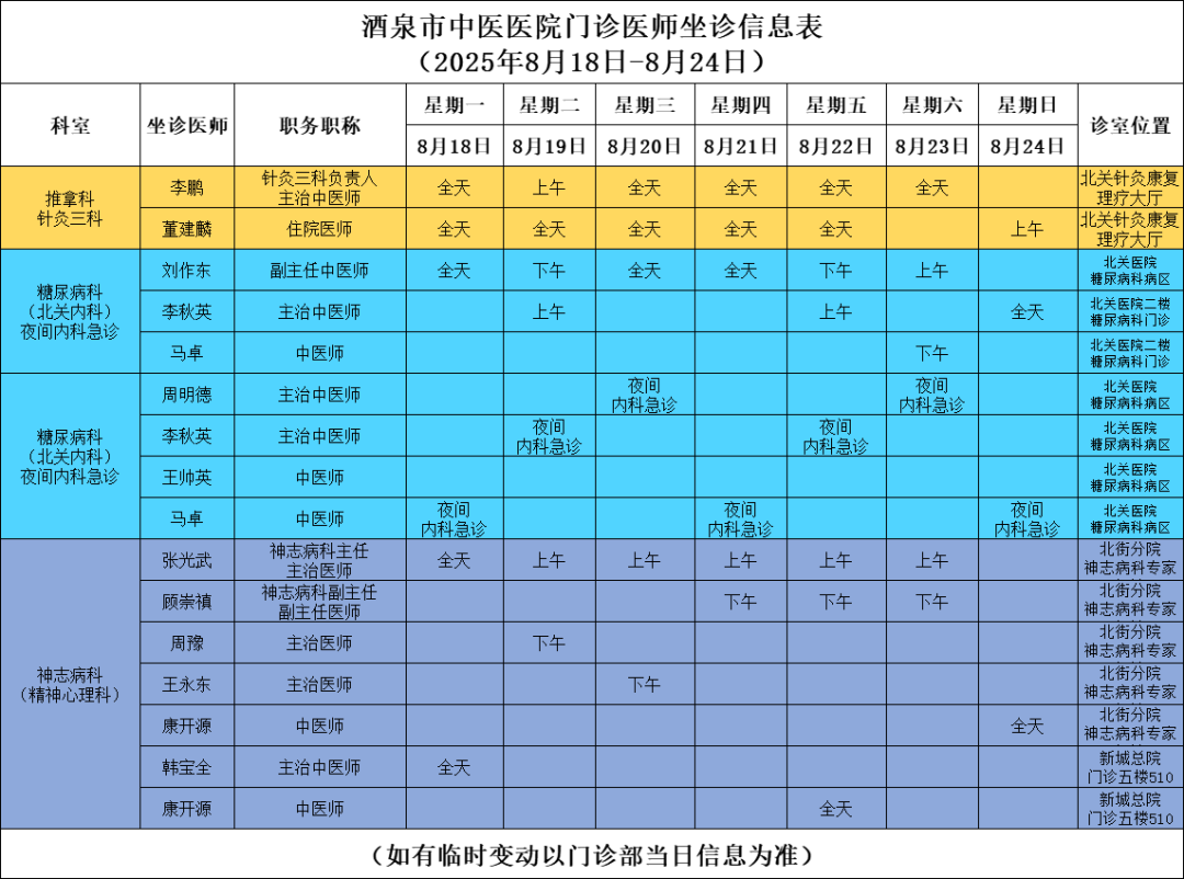 【通知】酒泉市中医医院2025年8月18日-8月24日门诊医师坐诊表